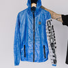 Jaqueta produzida a partir de velame reaproveitado, ressignificando material técnico de voo em uma peça leve, resistente e funcional.