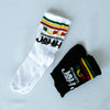 Kit com 2 pares da Meia Obrigado JAH, reunindo as duas versões da coleção: Branco e Preto.
